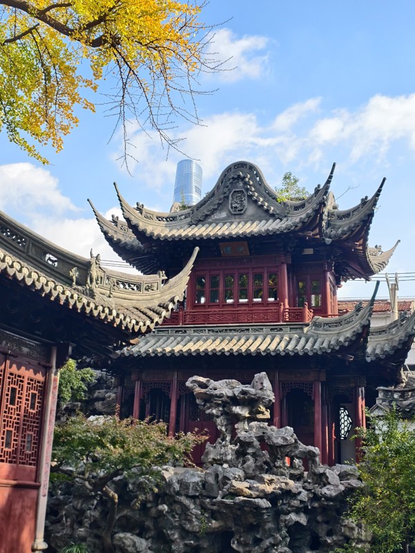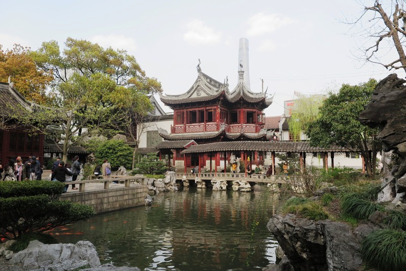 традиционный китайский сад Юй Юань среди небоскрёбов