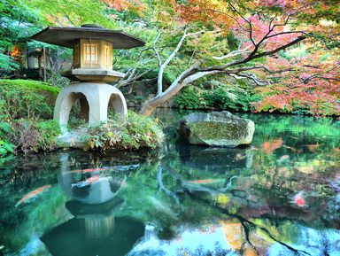 Традиционный японский сад Киёсуми с прудом, карпами кои, каменными...